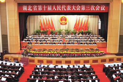 上午9時,主席團(tuán)常務(wù)主席楊永良主持開幕大會。本次會議應(yīng)到代表727人,實到代表682人,符合法定人數(shù)。他宣布:湖北省第十屆人民代表大會第三次會議開幕。