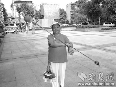 荊楚網(wǎng)消息(楚天都市報)(記者雷艷 實習(xí)生丁莉娟)繩子兩端各系一個彩色布球,在空中轉(zhuǎn)起來,彩球像流星飛舞(如圖)。昨日一大早,71歲的魏玉枝來到漢口中山公園,玩起流星球。