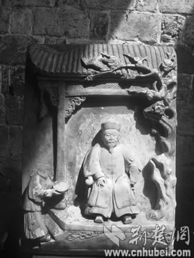 當(dāng)日,記者在該鎮(zhèn)八角亭村劉貴灣見(jiàn)到了這尊雕像。神龕下面,一村民小心翼翼地抱下一塊40余厘米高,30余厘米寬,10余厘米厚的“石頭”,上面布滿灰塵,一位村民虔誠(chéng)地為這位“太公”“洗了個(gè)澡”,一幅人物情景雕像出現(xiàn)在人們面前(如右圖):一位富態(tài)老年男子端坐太師椅,男子右側(cè)前方有一人托盤(pán)而立,盤(pán)子中間放著茶壺(此人頭部和茶壺都破碎不存),男子左前方則雕有一盆臘梅,直到屋頂,梅花和喜鵲栩栩如生,青磚碧瓦,歷歷在目,而富態(tài)男子就連胡須的“紋路”都雕了出來(lái),雙目傳神。