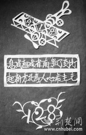 中國剪紙起源于裝飾藝術。樣式有窗花、燈花、喜花以及鞋墊花等。其中用來制作繡花底樣的雕花剪紙又名“花樣”,主要是供婦女刺繡使用的圖案底稿,大多是與民眾日常生活關系密切的傳統(tǒng)圖案。此次發(fā)現(xiàn)反映抗戰(zhàn)主題的50多張花樣剪紙,從構圖、技法上看,比較稚嫩、粗糙,但充分體現(xiàn)了藝人們的創(chuàng)新精神。其中最顯眼的是一張邊緣殘缺、破舊的黃裱紙,上面依稀可見“兒童團”三個字,是唯一的一張剪紙原稿。葉家慶介紹,寫著“打到了鄂南省減租減息,毛主席心(新)人馬北方新起”(如左圖)的花樣,從內(nèi)容分析,反映了1944年新四軍各軍區(qū)對日偽軍發(fā)動春夏秋季攻勢,并粉碎日偽軍反撲,解放國土、人口,改善華中各抗日根據(jù)地的斗爭形勢。