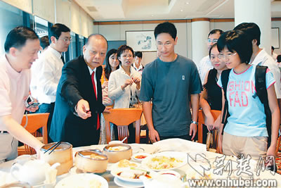 8月17日,曾憲梓與本報受助學子赴港參觀團座談。中午12點,曾憲梓老人興致勃勃地對同學們說:“孩子們,走,中午曾爺爺請你們吃茶點!”