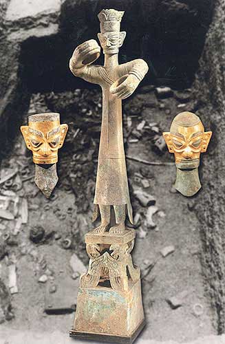 青銅金面人頭像:推測(cè)為神像(左,高42.5厘米)
