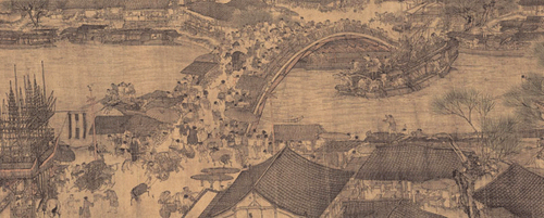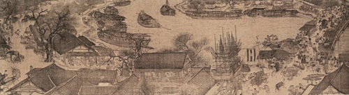 北宋京城汴梁及汴河兩岸的繁華和熱鬧的景象和優(yōu)美的自然風(fēng)光。作品以長(zhǎng)卷形式,采用散點(diǎn)透視的構(gòu)圖法,將繁雜的景物納入統(tǒng)一而富于變化的畫(huà)卷中,畫(huà)中人物500多人,衣著不同,神情各異,栩栩如生,其間還穿插各種活動(dòng),注重情節(jié),構(gòu)圖疏密有致,富有節(jié)奏感和韻律的變化,筆墨章法都很巧妙,頗見(jiàn)功底。