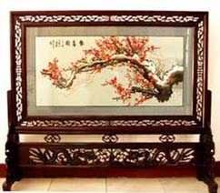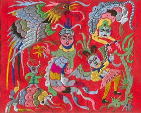 苗繡 刺繡,是苗族婦女盛裝不可或缺的飾物,主要有領花、肩花、襟花、背塊花、袖口花、裙鑲花、帽頂花、帽頂花等品種。苗族刺繡,整體上多為幾何構(gòu)圖,古樸多姿。其圖案因繡片條、塊的不同,分為幾何二方連續(xù)式和四方連續(xù)式構(gòu)圖。其圖案取材于生活中常見的草木、鳥獸、蟲魚、器具等。圖案的整體布局一般以菱形為立體紋樣,常見的是大菱形中套小菱形,小菱形又分別由不同色彩的方、圓、三角點狀組成。條狀繡片,多用點、線或線面組合,一整二剖構(gòu)圖。繡片是按布的經(jīng)緯戳針,故曲線多折角。大塊繡片,如背塊花等,多用菱形四方連續(xù)構(gòu)圖,并在其中布以對稱的變形幾何點及其他折線。所有繡片,粗看五彩斑斕,細觀則不同色線組圖分明,交錯重疊,既復雜多變又結(jié)構(gòu)嚴謹、條理清晰。繡法很多,有平繡、凸繡、辮繡、堆花、縐繡、纏繡、挑繡、抽花等。平繡是最曾遍的繡法。這種繡法是重于圖案布局的美觀勻稱,色調(diào)鮮明,有明顯的物象感。凸繡流行于凱里、臺江部分地區(qū),它是在底布上多鋪幾層紙花,使所繡圖案凸出,有立體感。辮繡只在雷公山巴拉河一帶流行,其方法是將若干根色線編成辮子,按設計圖案平鋪于底布上,用絲線釘牢即成。圖案色調(diào)大致是青年女子鮮艷,中年以上婦女稍渾暗。如凱里、黃平、施秉等地,姑娘及較年輕婦女的盛裝刺繡以青布作底,繡大紅,間有少量白黃綠之色,亮麗醒目;中年以上婦女盛裝刺繡,亦以青布作底,以紫藍為基調(diào),間以少許桔紅、綠、白等色,顯得深沉穩(wěn)重。 京繡 京繡又稱宮繡,明清時期開始大為興盛,多用于宮廷裝飾、服飾,用料講究、技術(shù)精湛、格調(diào)風雅,民間高檔的宮繡大都與皇宮有著千絲萬縷的聯(lián)系。京繡屬手工刺繡,所以在今天機繡發(fā)達的時候,為區(qū)別于機繡又名“手繡”。京繡在解放后,逐漸形成了自己鮮明的藝術(shù)特點與風格,其選料精當貴重,針工巧妙得體,色彩絢麗豪華,格調(diào)高雅。其中最好為針工中的“平金打籽”繡。這種繡,是以真金捻線盤成圖案,或結(jié)籽于其上,十分精致,華貴。 發(fā)繡 發(fā)繡,又稱“墨繡”。是以人的頭發(fā)為材料,在綢緞、絲絹或滌綸布上精心繡制的特種藝術(shù)品。具有淡雅、不褪色、耐腐蝕、利于收藏等特點。彩色發(fā)繡是相對于單色發(fā)繡而言,它是指以不同人種的天然色澤發(fā)絲為材料,遵循色彩規(guī)律,在繃平整的布帛上施針度線,塑造形象的藝術(shù)。作品的質(zhì)感效果特別好, 畫面有微妙的色彩變化,層次較單色發(fā)繡豐富,技巧靈活多變,形象更加栩栩如生。 材料的特質(zhì)屬性賦予發(fā)繡藝術(shù)獨特的魅力,具有豐富的人文內(nèi)涵,如用自己的頭發(fā)繡一幅寫真“二我”,具有生命的直接紀念意義。作品集繪畫與刺繡為一體,具有一定的美學價值和經(jīng)濟價值,又能經(jīng)久保存,千年不變,可謂收藏極品。 甌繡 由于溫州地處甌江之濱,故得名“甌繡”。400多年以前,浙江溫州地區(qū)已運用刺繡美化服飾, 繡品技藝也達到相當水平。據(jù)說甌繡最早產(chǎn)生于民間婦女之手,那時的刺繡品種有衣服、小兒帽 圈、圍涎、錦肚、婦女鞋面、枕頭、荷包等。題材只有花鳥魚蟲之類。甌繡真正成為供欣賞的藝 術(shù)品只有60多年歷史。1922年前后,溫州刺繡藝人林森友在上海一家刺繡莊發(fā)現(xiàn)了湘繡畫片, 回來后開辦了“美艷”刺繡作坊,仿照湘繡畫片的技法,改進甌繡生產(chǎn)。從此,溫州出現(xiàn)了甌繡畫片。