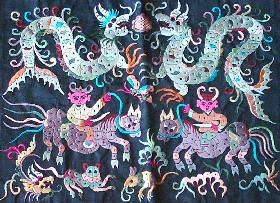 魯繡 魯繡——山東地區(qū)的代表性刺繡,是歷史文獻中記載最早的一個繡種,屬中國“八大名繡”之一。 “齊紈”、“魯縞”早在春秋戰(zhàn)國時期已是全國聞名的產(chǎn)品。當時齊國有“冠帶衣履天下”的盛譽。據(jù)《論衡》記載:“齊郡刺繡,恒女無不能者,目是而手狎也”。 從唐代后期,我國北方連年戰(zhàn)亂,桑地及織繡生產(chǎn)受到嚴重破壞,若干織繡工人遷徙南方,北方刺繡長期衰落。直至明代后期,魯繡又聞名于世,達到高度水平。 現(xiàn)在臨淄考古組存有東周時期的刺繡殘片,鄒縣文物保管所存有元代的魯繡珍品,故宮博物院存有較多的明代魯繡,如《百鳥朝鳳圖》、 《羅漢圖》,其構(gòu)圖嚴謹,手法多樣,花紋粗獷雄健,質(zhì)地堅實,色彩對比強烈,形象生動,是魯繡杰出的代表作。 魯繡主要特點是:構(gòu)圖簡練樸實、色彩明亮對比強烈,針法粗細相間,極富裝飾性和立體感,既華麗而又素雅。其代表產(chǎn)品主要有花鳥、書法、人物。 魯繡憑其工藝精湛、構(gòu)圖和色彩迷人受到了全世界人們的寵愛。早在兩千年前的漢朝,魯繡就通過絲綢之路傳到西亞,轉(zhuǎn)而傳向歐洲的羅馬帝國。目前,刺繡已出口到一百多個國家和地區(qū),成為中國刺繡文化與和平藝術(shù)的使者。 汴繡 汴繡,也稱宋繡,距今已有八百余年歷史,是我國名繡之一,素有"國寶"之稱。它以繡工精致,針法細密,圖案嚴謹,格調(diào)高雅,色彩、秀麗而著稱,早在宋代就已馳名全國。據(jù)記載:北宋時期已有"文繡院"。當時皇帝的龍袍、官員的朝服、烏紗帽、朝靴都為刺繡精品。據(jù)《東京夢華錄》載,民間刺繡也極為興盛,到處"繡簾相拓"、"錦繡交輝"。宋代刺繡工藝已發(fā)展到相當水平,據(jù)明代屠龍《畫箋》所載,"宋之閨繡畫……女紅之巧,十指春風,迥不可及'。北宋滅亡,汴繡遭動一蹶不振。 為了繼承宋代閨繡這一傳統(tǒng)工藝,開封汴繡廠于一九五四年成立。建廠后,新老藝人在繼承傳統(tǒng)工藝的基礎上,錄蹤探微,博采眾家之長,反復試驗,在傳統(tǒng)的以平針為主的技藝之上,又創(chuàng)新了散針、亂針、滾針、水紋蒙針等幾十種針法。多種針法的交替使用,不僅能把陰陽遠近一一表現(xiàn)出來,而且表現(xiàn)內(nèi)容豐富,富有立體感。汴繡針法既長于刺繡花鳥蟲魚飛禽走獸,又善于創(chuàng)作氣勢磅礴的山水圖景,刻畫人物形象更是細致傳神。繡品既具有蘇雅潔活潑的風格,又具有粵繡明快豪放的特點。1959年汴繡《清明上河圖》繡成,作為國慶十周年獻禮,陳列在人民大會堂,它以針代筆,以線代暈,使這幅宏偉浩繁的歷史風俗畫卷逼真地展現(xiàn)在人們眼前。作品展覽時,中外客人無不嘆服。 改革開放以來,汴繡工藝又得到進一步的發(fā)展與創(chuàng)新,精品選出,如《清明上河圖》、《百駿圖》、《五牛圖》、《韓熙載夜宴圖》、《簪花仕女圖》等繡品均為國家收藏或被國外友人重金購去。此外,汴繡除刺繡之外,還有單面繡、雙面繡、三異繡及大量機繡產(chǎn)品,品種繁多,題材廣泛。 漢繡 漢繡主要流行于荊沙、武漢、洪湖一帶。漢繡作品曾多次在京展出,還參加了巴黎、華沙等國際展覽,受到好評。 漢繡,以楚繡為基礎,融匯南北諸家繡法之長,揉合出了富有鮮明地方特色的新繡法。它的用針有別于四大名繡……蘇繡、蜀繡、湘繡和廣繡,采用一套鋪、平、織、間、壓、纜、摻、盤、套、墊、扣的針法,以“平金夾繡”為主要表現(xiàn)形式,分層破色、層次分明,對比強烈。追求充實豐滿、富麗堂皇的熱鬧氣氛,繡品可以枝上生花,花上生葉,葉上還可出枝,充分體現(xiàn)了“花無正果,熱鬧為先”的美學思想,呈現(xiàn)出渾厚、富麗的色彩。 從春秋中期到戰(zhàn)國時,楚國的刺繡品已遠銷到西伯利亞地區(qū),可見其刺繡業(yè)之發(fā)達。南方的楚國絲織業(yè)足以代表當時我國絲織品工藝技術(shù)的最高水平。屈原的《楚辭·招魂》為我們描繪了一幅楚宮絲織品圖畫,“翡翠珠被,爛齊光些。蒻阿拂壁,羅帳張些;纂組綺縞,結(jié)琦璜些!鋷鋷,飾高堂些”,“被文服纖,麗而不奇些。”這種需求對刺繡品的生產(chǎn)、發(fā)展的刺激是不難想見的。同時,楚文化氛圍下民間戲曲的發(fā)達、巫風巫月術(shù)的盛行又為刺繡走向民間提供了生長的沃土。 漢繡的鼎盛期是清末民初。咸豐年間,漢口設有織繡局,集中各地繡工繡制官服和各種飾品。清末,在武昌的營坊口、塘角、白沙州、積玉橋和漢口的黃陂街、大夾街一帶,開有許多繡鋪,漢口還有一條繡花街。當時的漢繡產(chǎn)品主要分三類:作為生活用品的有繡衣、繡枕、門簾、帳沿、繡鞋、頭巾、圍裙、荷包等,多用于閨閣陪嫁。其中,漢口的繡花戲衣頗具名氣。二是裝飾品。有壁掛、中堂、屏風、彩帳、堂彩、龍衣、獅皮、戲裝、道具等。三是敬神賽會的禮儀用品,包括神袍、袈裟、彩幡等。 抗戰(zhàn)時期,日軍侵占武漢,漢口繡花街被燒毀,漢繡日趨凋零,技藝幾近失傳。新中國建立以后,漢繡才重放光華。80年代,漢繡產(chǎn)品已由原來的民用小繡品和少量古典戲劇繡服發(fā)展到帳簾、披風、被面、枕套、服裝、大幅、中堂、條屏、折頁、搖件和屏風等十多個品種。 江陵馬山一號墓發(fā)掘出的戰(zhàn)國中期繡品,進一步證實了漢繡的歷史承載量。繡線顏色以紅、黃、綠、蘭等亮色為