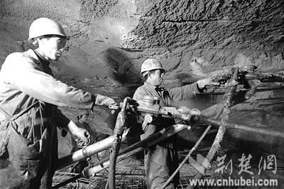 穿著雨衣的工人們手持風(fēng)槍,正在腳手架上下打爆破眼,山體里的水嘩啦啦直往下噴,然后順著挖好的水槽排向洞外,最多時(shí)一天要排3000立方米。“這水算小的!”也許是察覺出我們眼神里的擔(dān)心,包秀峰輕松笑笑,仿佛一切都在他們掌控中。他甚至調(diào)侃說,“瞧,我們都穿皮鞋上班,施工環(huán)境沒你們想象中那么艱難!