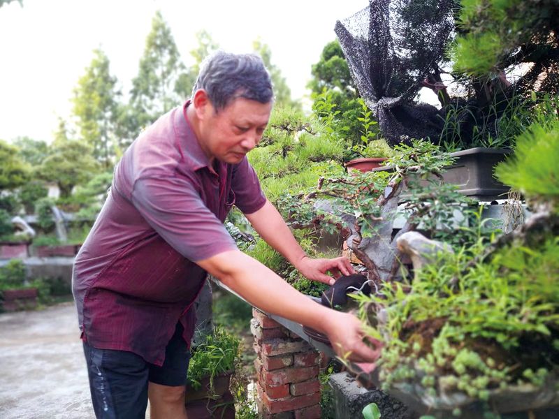 30多年來,孫勝望每天堅持下班后給盆景澆水,家里的走廊過道、院子里,平頂上密密麻麻全是擺放的盆景。最多時他的盆景達2000多盆,成了遠近聞名的“盆景大戶”。僅澆水每天就要花費半天工夫,幾乎每個晚上他都要打著手電筒堅持把水澆完?!皾菜孟蠼o嬰兒喂水,施肥好比喂奶,修枝好比剪指甲,而打農(nóng)藥則是給他們治病……”在他心目中,每一個盆景都是一個嗷嗷待哺的嬰兒,孫勝望總是悉心照料,精心呵護。