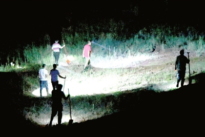22:43分。在長(zhǎng)江赤壁干堤11號(hào)哨所責(zé)任堤段,七束燈光在護(hù)堤林中閃耀。