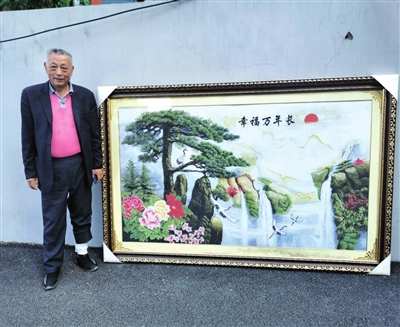 據(jù)金開珠介紹,這幅《幸福萬年長(zhǎng)》十字繡長(zhǎng)達(dá)3米,高達(dá)2米,由老伴王晚珍手工繡制而成。本有一位老板想以15萬元的價(jià)格收購(gòu),但因?yàn)樽约汉屠习榈纳眢w原因,十字繡花了三年多時(shí)間才繡好,老板等不了那么久另尋他人購(gòu)買了,所以十字繡至今還沒有賣出去。