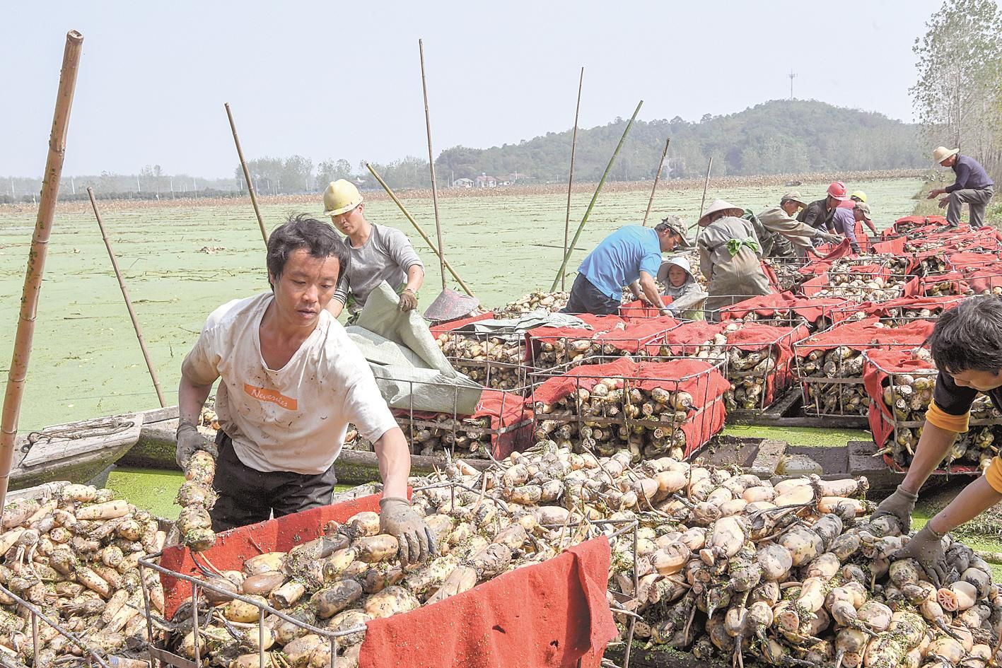 10月13日,嘉魚縣陸溪鎮(zhèn)農(nóng)民趁著晴好天氣挖藕。這些蓮藕經(jīng)嘉魚鴻富農(nóng)產(chǎn)品有限公司加工后,將出口至東南亞和北美等地區(qū)。嘉魚縣蓮藕、蓮子、藕帶是區(qū)域特色明顯的優(yōu)勢農(nóng)產(chǎn)品。近年來,嘉魚縣把發(fā)展蓮藕作為調(diào)整農(nóng)業(yè)產(chǎn)業(yè)結(jié)構(gòu)、增加農(nóng)民收入的重要途徑。目前,全縣蓮藕種植面積4.85萬畝,2019年全縣蓮藕產(chǎn)業(yè)實現(xiàn)綜合產(chǎn)值5.6億元。