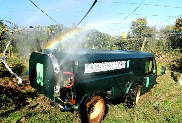 “一輛植保車輕輕松松一小時(shí)噴灑作業(yè)可以達(dá)到25畝以上,這是人工一天‘拉了瓦’也到達(dá)不了的的作業(yè)量。”11月12日,在神山興農(nóng)公司位于官塘驛鎮(zhèn)御屏山村的半島獼猴桃基地,熊堃坐進(jìn)1.5米身高的袖珍新能源植保車,拉動(dòng)手閘,轉(zhuǎn)動(dòng)方向盤(pán),一番操作后,通過(guò)7條噴孔噴出的霧狀藥液在陽(yáng)光下形成一道彩虹。