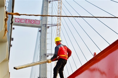 來(lái)自鄂州的胡榮鵬是大橋中跨鋼主梁吊裝班的班長(zhǎng),吃完中午飯,他和工友們便早早地來(lái)到施工作業(yè)面,開(kāi)始吊裝鋼橫梁。