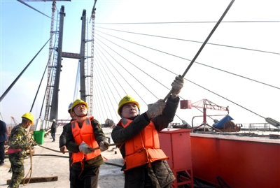 “再起來(lái)一點(diǎn),往左偏5公分,好,停……”在胡榮鵬的指揮下,一塊離水面40多米高的鋼梁被順利吊起。