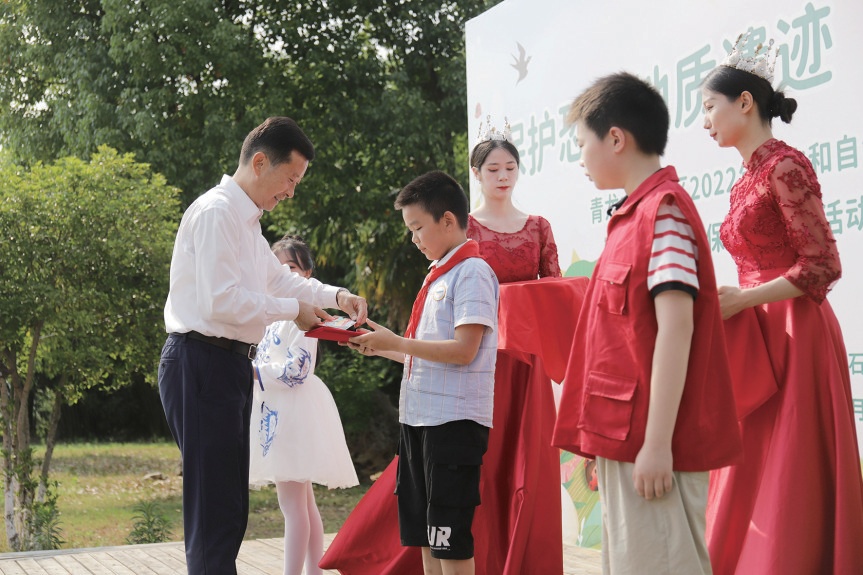 湖北青龍山恐龍蛋化石群國家級自然保護區(qū)管理局局長、黨組書記姚天國為獲獎學(xué)生頒獎。