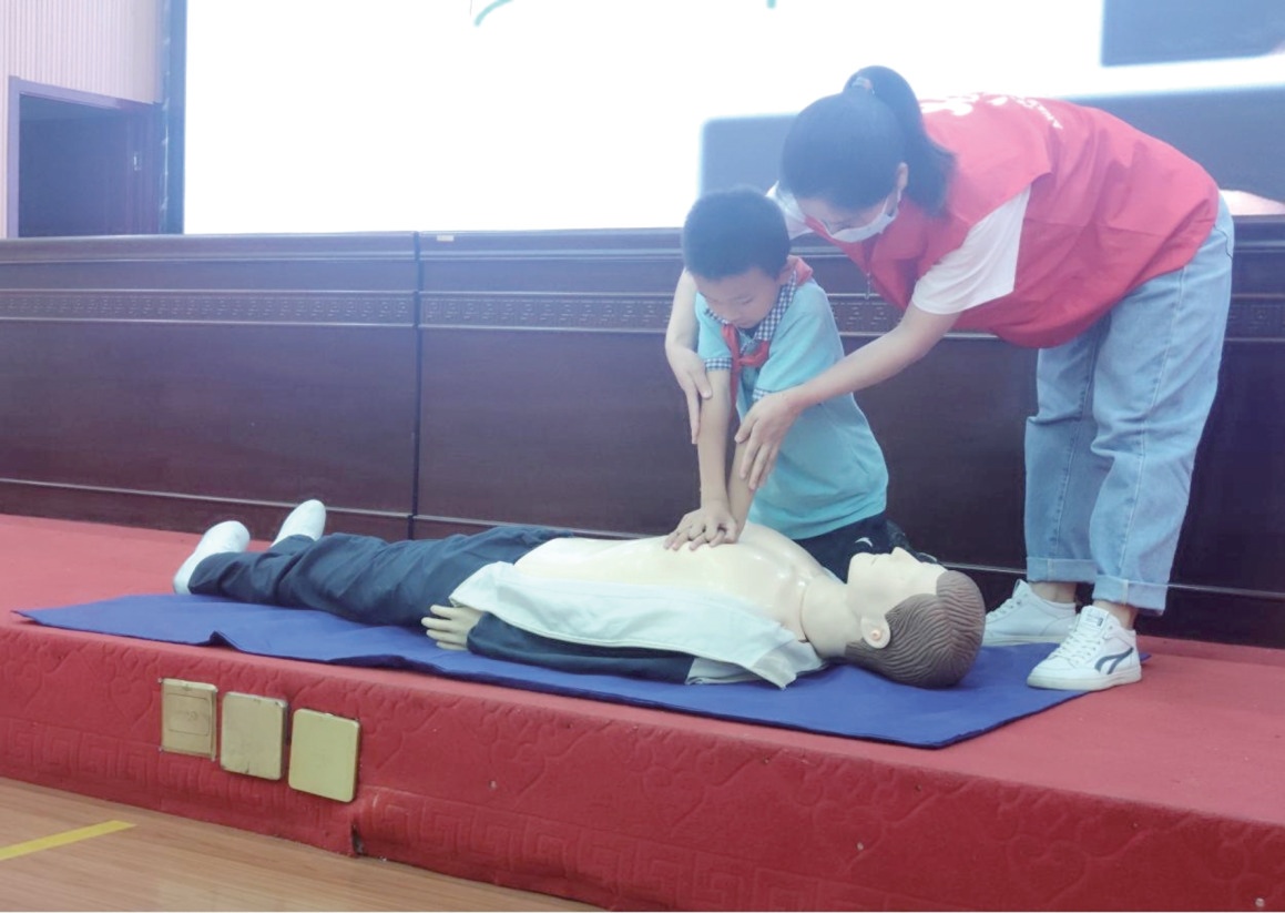活動現(xiàn)場,杜成芬還為大家演示了心肺復蘇術和海姆立克急救法,學生們在老師的指導下認真學習演練。