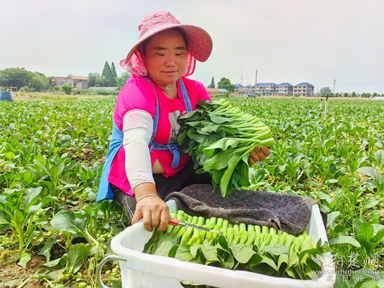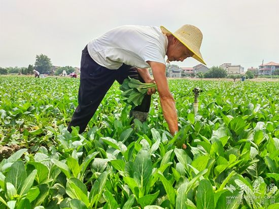 在黃梅縣分路鎮(zhèn)鼎旺農(nóng)業(yè)農(nóng)民專業(yè)合作社廣東菜心種植基地,近100名割菜工手戴指甲刀,在技術(shù)顧問呂美標(biāo)的指揮下,分散到各個(gè)地塊,不一會(huì)兒,路兩旁就整齊堆滿了菜心,合作社社長(zhǎng)石成旺拿出手機(jī)聯(lián)系車輛,經(jīng)過(guò)整理、清洗,剛收割的菜心就被送到凍庫(kù),準(zhǔn)備第二天運(yùn)往國(guó)內(nèi)外。
