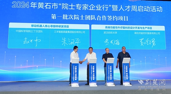 現(xiàn)場還舉行了項目簽約活動,簽約移動機器人核心零部件研發(fā)項目、高端功能性牛仔面料的設計開發(fā)與生產(chǎn)項目等2個院士專家合作項目、球墨鑄鐵管壁測量項目等10個人才合作項目以及4個人才服務合作項目,并為鄂東技師學院國家級高技能人才培訓基地授牌。