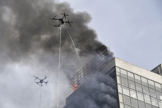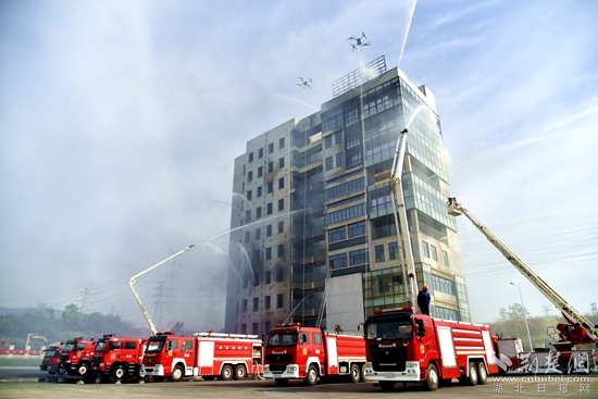 在滅火救援過程中,黃石消防首次設(shè)置無人機滅火科目,配合云梯車人員疏散、火場緊急避險、高層供水、內(nèi)部攻堅等實戰(zhàn)化內(nèi)容,向參會人員展示了黃石市消防救援隊伍建設(shè)成效。