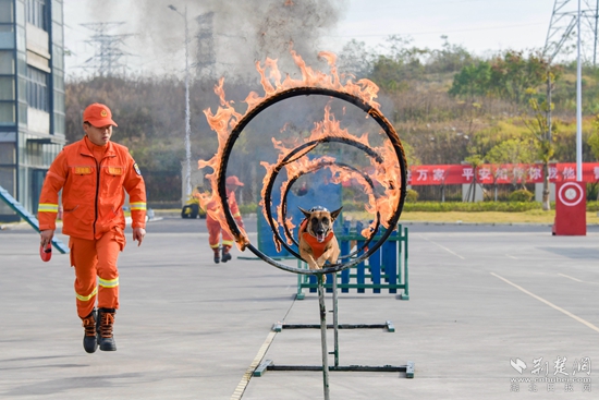 樓層綜合滅火演練前,現(xiàn)場先后開展了搜救犬綜合搜救操、繩索救援上升與下降操、綜合滅火救人操等科目。尤其是搜救犬互動表演,讓人驚嘆不已?!坝行覅⒓舆@次活動,還能‘擼’到搜救犬,近距離觀看到它們?nèi)绾斡柧殹⑺丫?,我很激動?!焙睅煼洞髮W文理學院消防志愿者王晨睿說。
