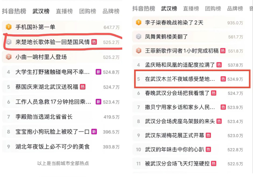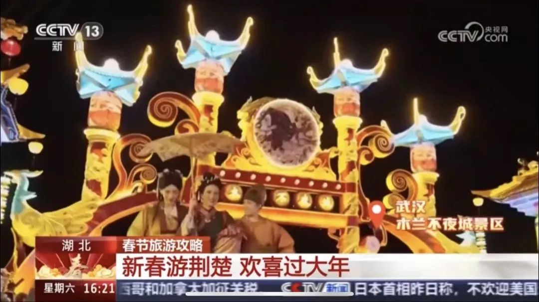 2月1日,央視新聞直播間欄目以《新春游荊楚,歡喜過大年》為題,聚焦湖北武漢鄉(xiāng)村游。解說詞說道:“武漢木蘭不夜城景區(qū),是以沉浸式夜游和木蘭文化實景演出為特色的旅游景區(qū)。春節(jié)假期,除了賞燈會、看民俗,木蘭不夜城全新打造的沉浸式劇場《楚地長歌》,為游客帶來更多元化的沉浸式打卡體驗”。