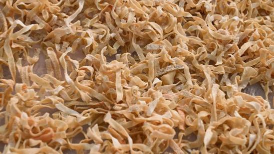 黃陂豆絲用蚌殼來制作,主要是為了攤平面糊。蚌殼材質輕盈,便于操作使用,且蚌殼弧形的角度與農家土灶用的鍋,貼合度高,攤出來的豆絲厚薄均勻。