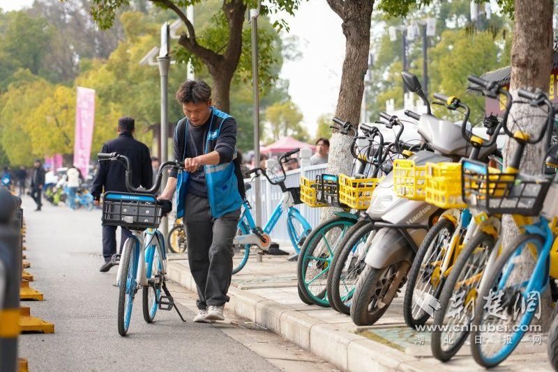 “你好,請往這邊有序停車。前行200米就是櫻園大門,那邊不好停車。”在魯磨路攬翠停車場附近,單車運維人員正在引導(dǎo)騎行游客前往指定區(qū)域停放單車。