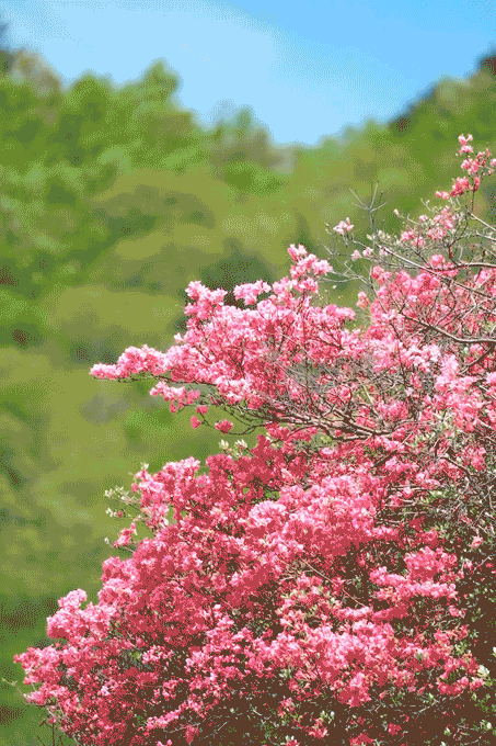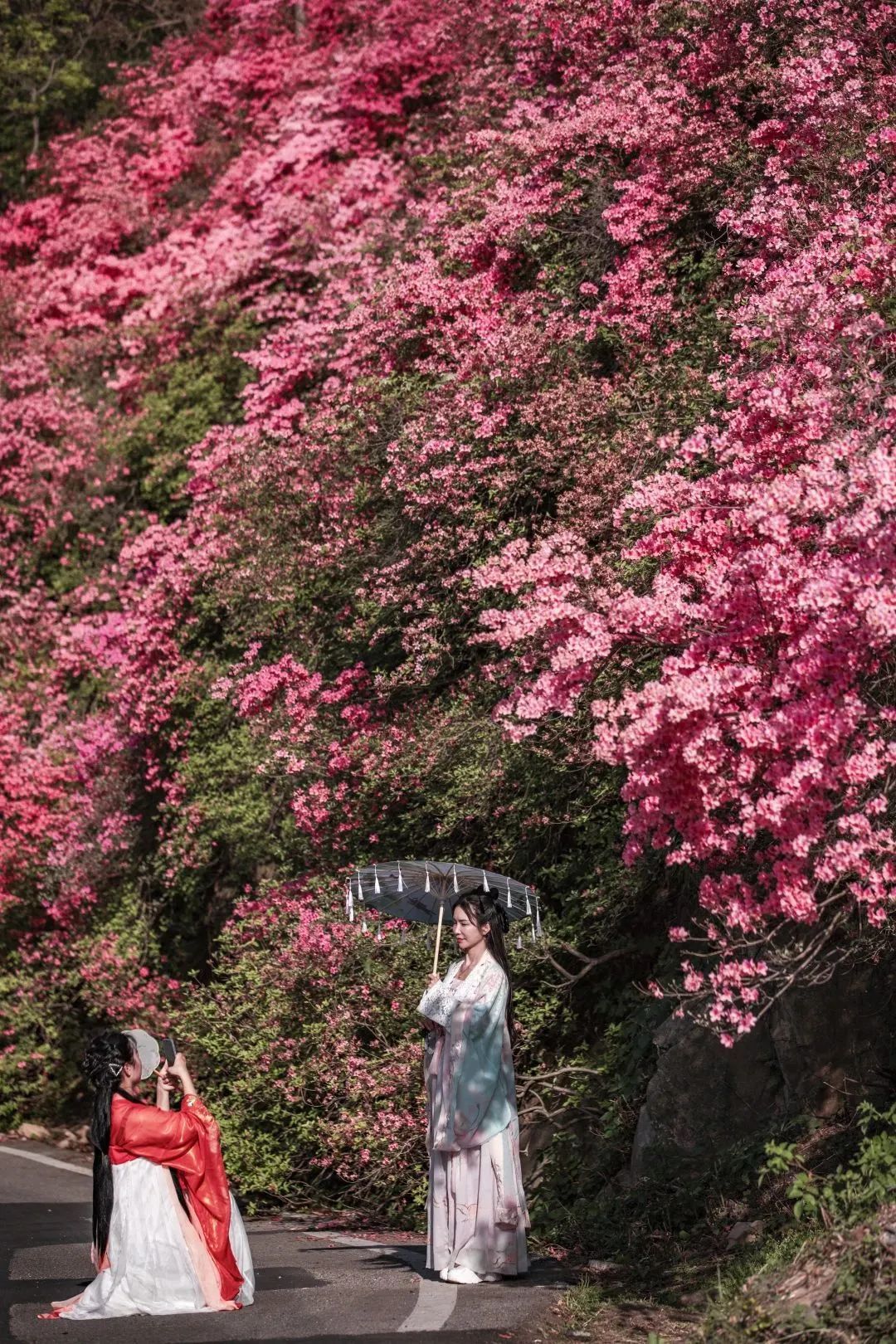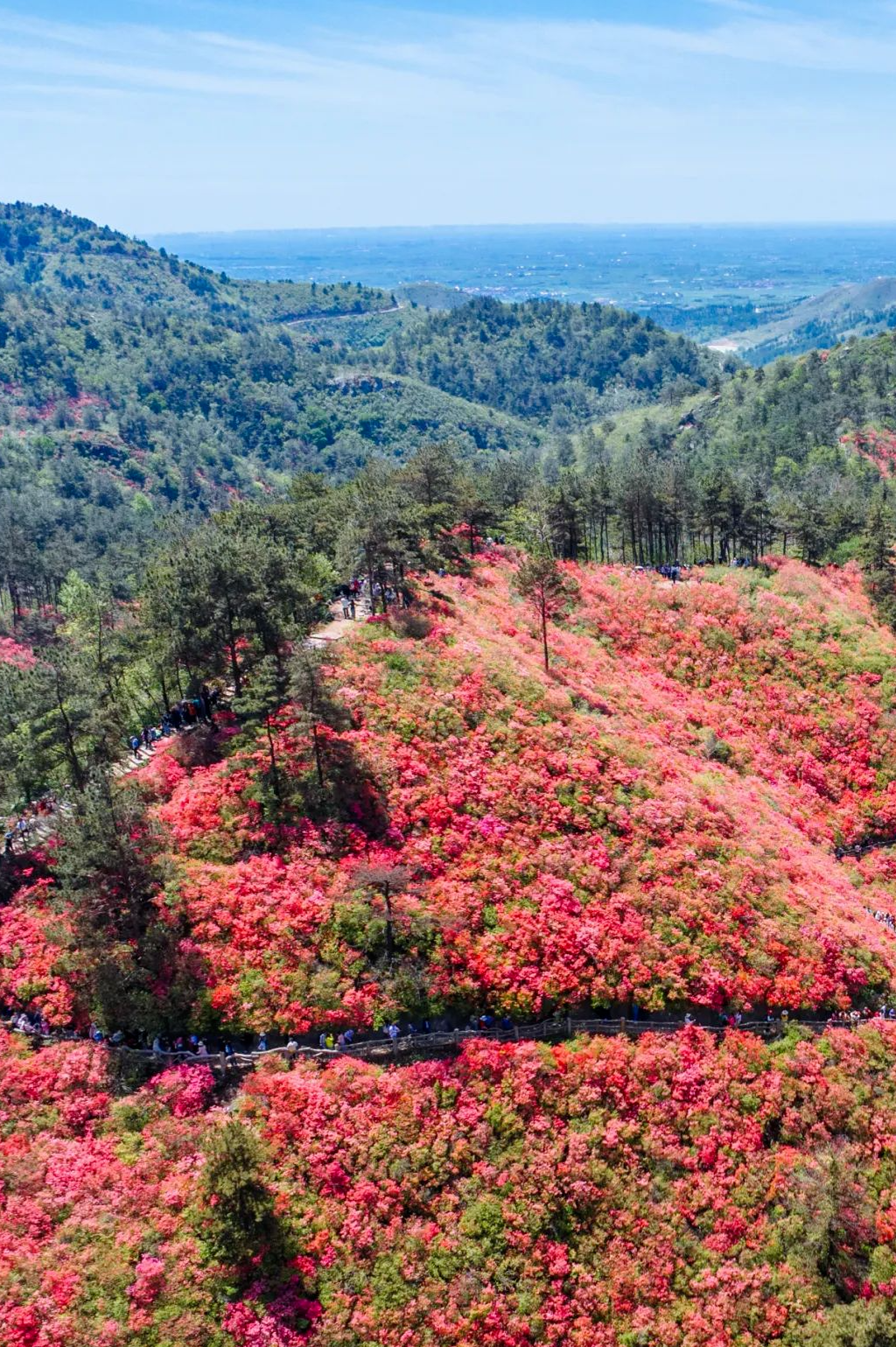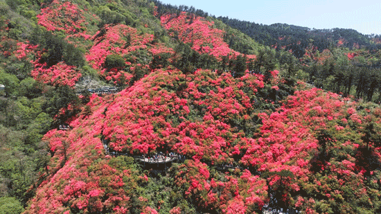 武漢市文化和旅游局,贊1165“人間仙境云霧山,層巒疊嶂映紅天”,木蘭云霧山的杜鵑花以映山紅為主,從3月中旬開始,萬畝野生紅杜鵑競相綻放,春風吹過,此起彼伏,如霞似火,嫣然一片杜鵑花的海洋。
