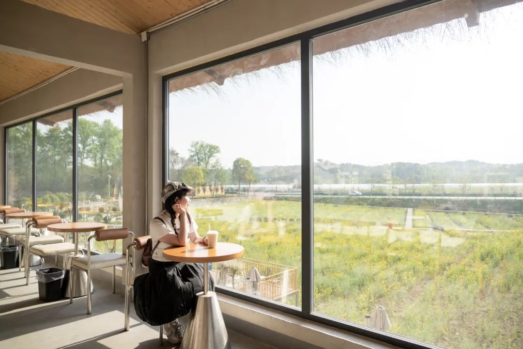 靠窗的吧臺也十分吃香,時不時有年輕的女孩端起咖啡,輪番坐上吧臺椅拍照,背景是屋外的稻田與花海,非?!俺銎?。