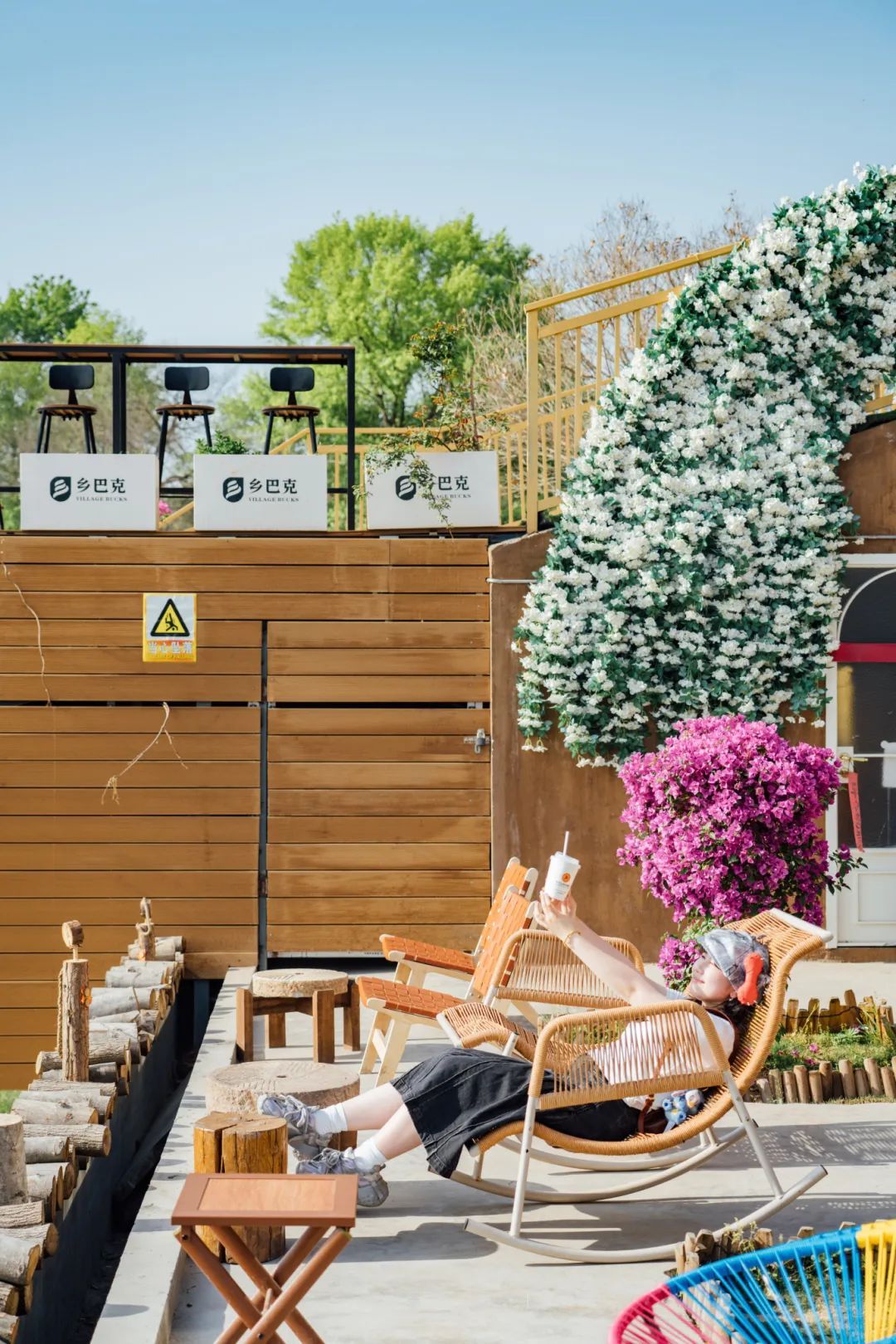 ▲靠在躺椅上喝杯咖啡,賞賞花景,班味全消