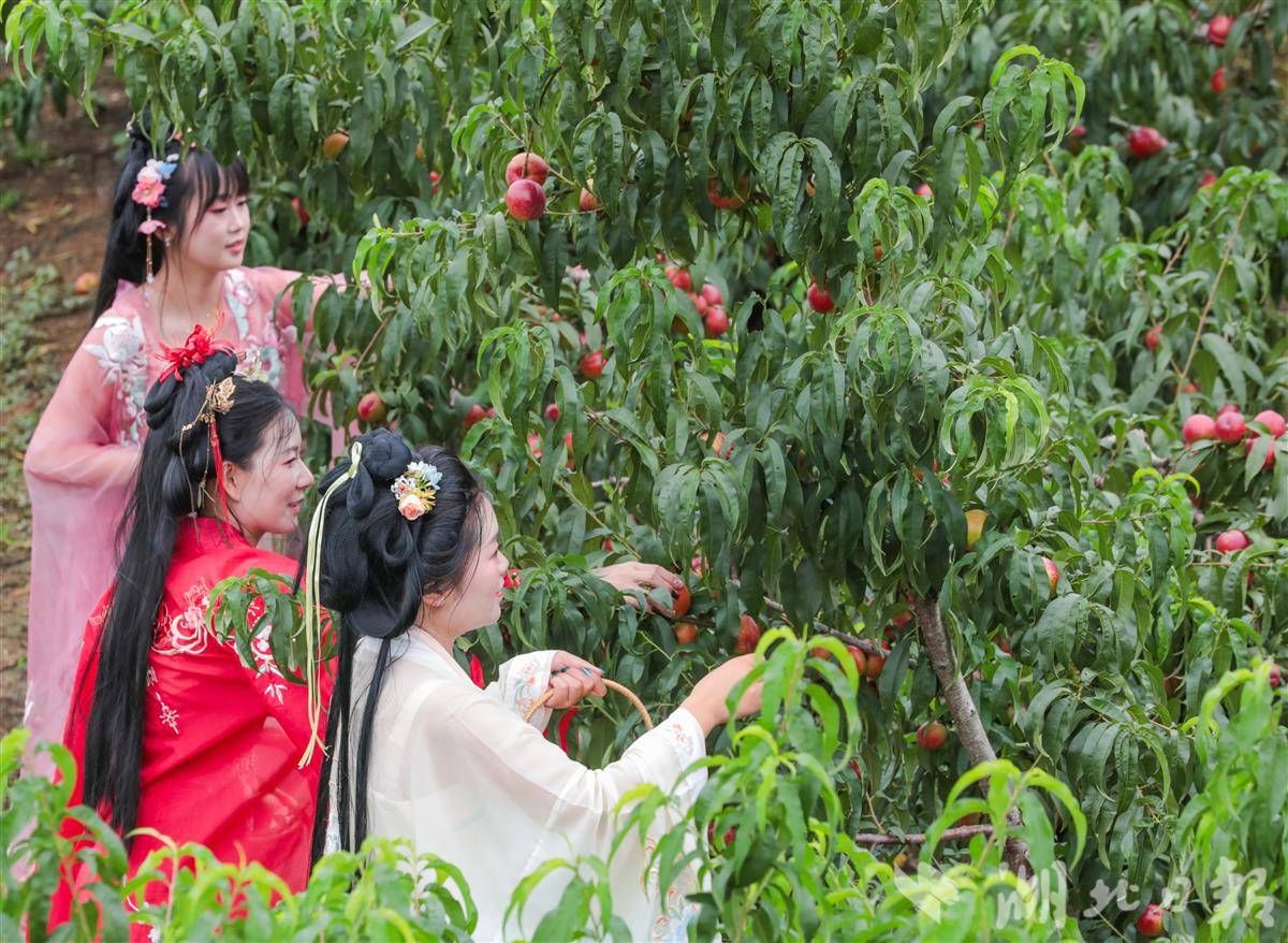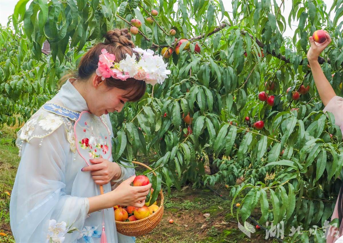 6月10日,穿著漢服的演員在采摘蜜桃。(湖北日?qǐng)?bào)通訊員 陳超 攝)