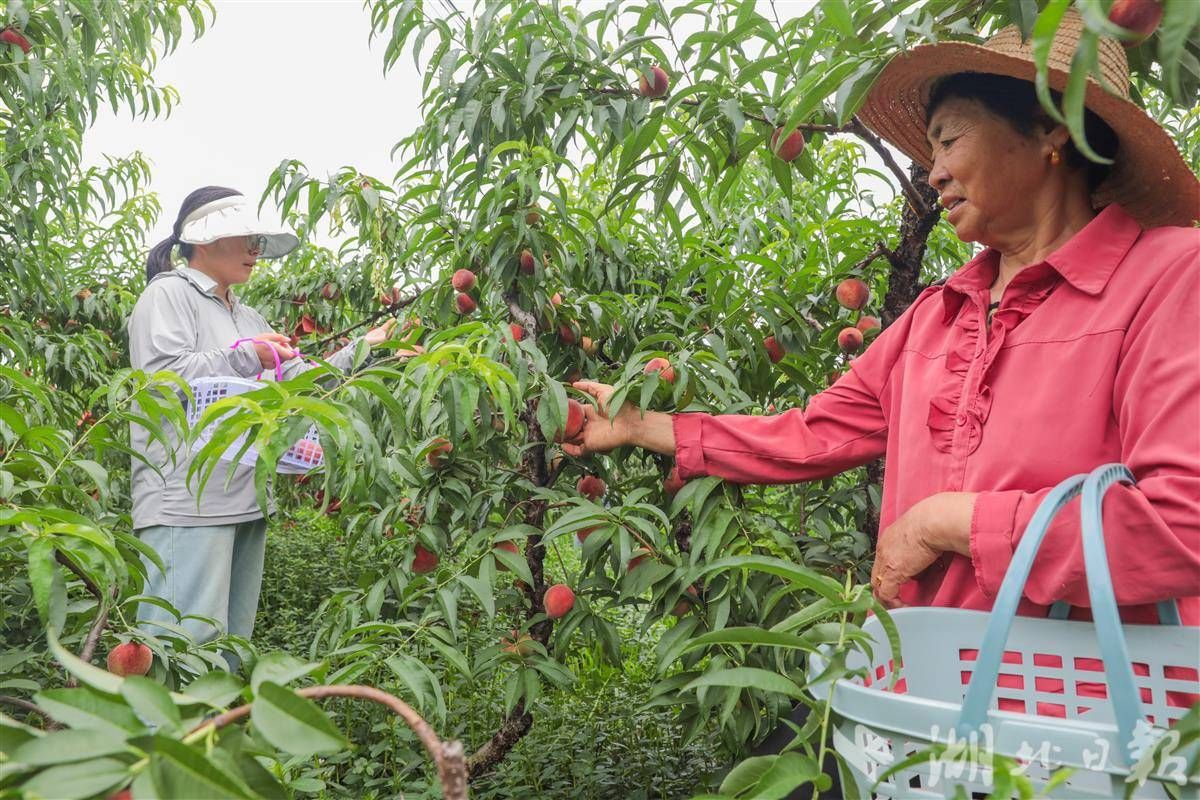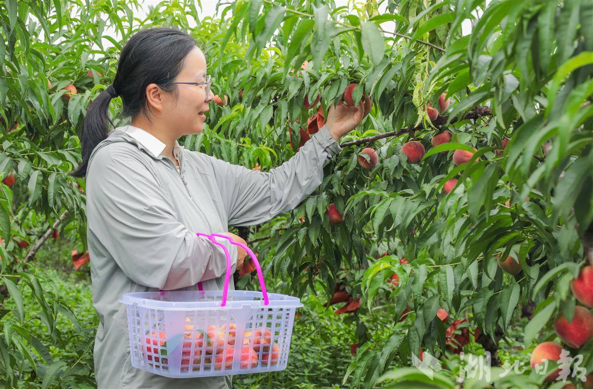 6月10日,游客在卓爾桃花驛小鎮(zhèn)采摘蜜桃。(湖北日?qǐng)?bào)通訊員 陳超 攝)