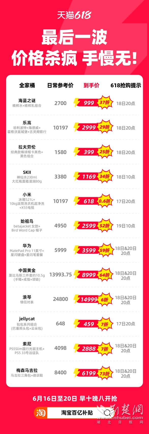 荊楚網(wǎng)(湖北日?qǐng)?bào)網(wǎng))訊(通訊員 朱飛)6月16日至6月20日,天貓618迎來(lái)最后一波瘋狂加碼。在官方立減85折基礎(chǔ)上,諸多權(quán)益都有不同程度的升級(jí)。