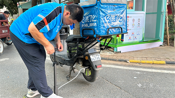 小哥使用打氣筒工具。 通訊員供圖