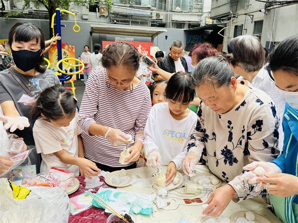 活動現(xiàn)場,各區(qū)域精彩紛呈?!扒墒肿鲈嘛灐弊钍菬狒[,家庭成員圍在桌前,揉面、包餡、壓模默契配合,一個個晶瑩的冰皮月餅新鮮出爐;銀杏樹上掛著百余條燈謎,“舉頭望明月(打一中藥名)”“中秋菊盛開(打一成語)”引得居民駐足思索,不時有人喊出答案,歡呼聲此起彼伏。小朋友們也有專屬樂趣,“月滿花環(huán)”區(qū)里,用仿真花材編出中秋裝飾;“玉兔拔蘿卜”游戲中,你追我趕比拼速度,歡笑聲此起彼伏。