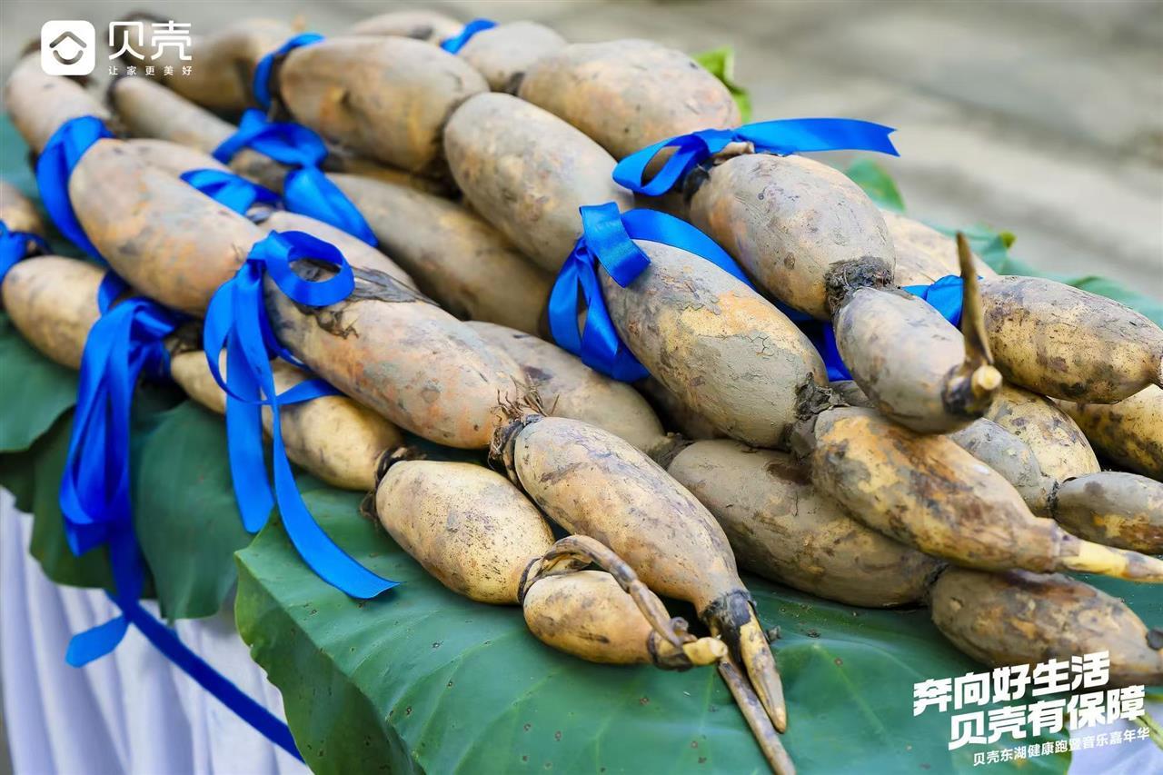 有趣的是,本次比賽為前三名選手準(zhǔn)備了迪卡儂山地自行車、王一博同款SKG腰部按摩儀器、Artsmith筋膜槍深層肌肉按摩器外,還向他們特別贈(zèng)送了1根長(zhǎng)約1.6米的蓮藕。這也是當(dāng)天剛從藕塘里挖出的新鮮野藕。這一充滿特色的獎(jiǎng)品,寓意著“跑在東湖,暖在胃里”,讓跑友們?cè)谙硎苓\(yùn)動(dòng)快樂的同時(shí),也能感受到濃濃的江城風(fēng)味。