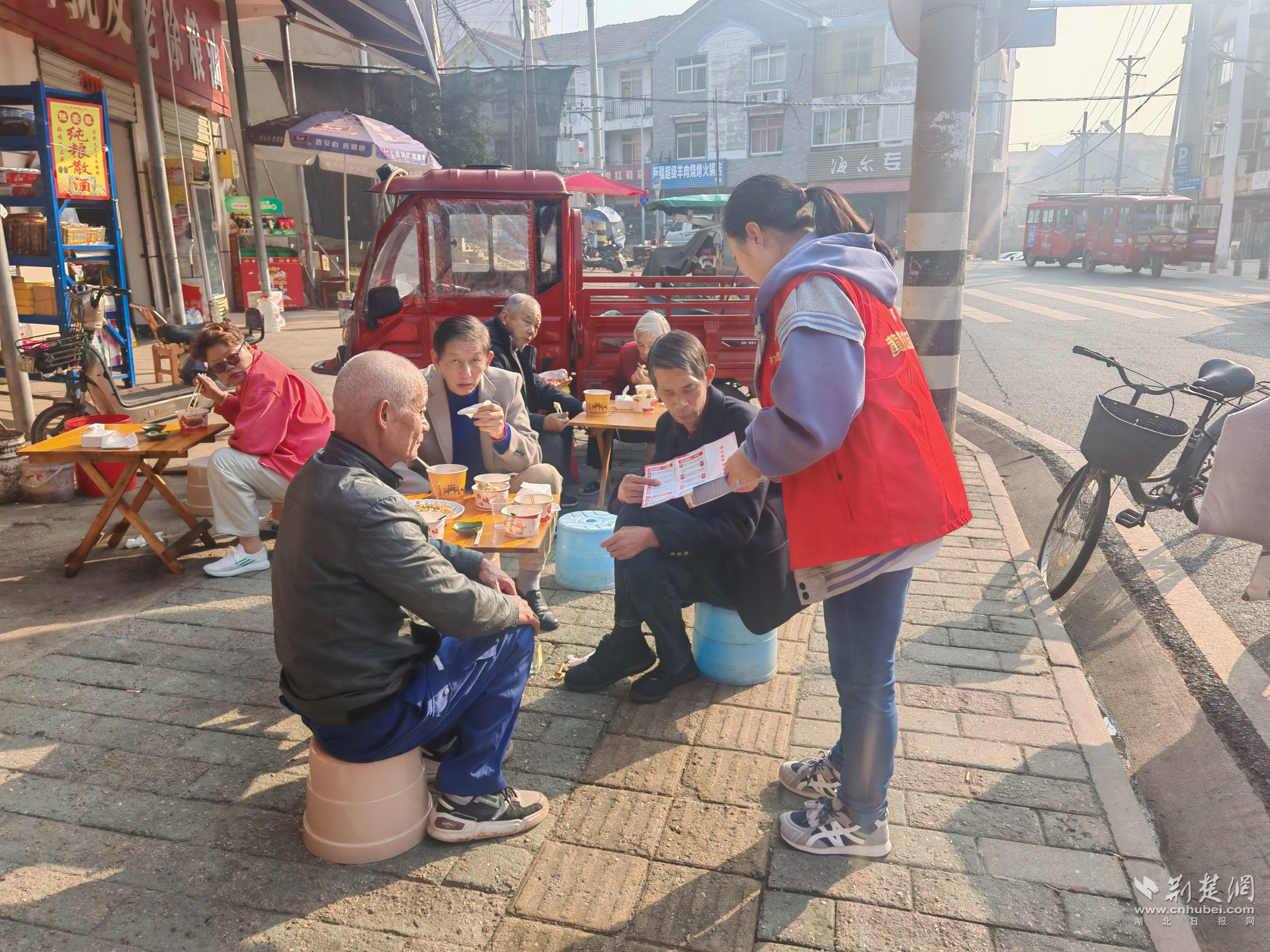 社區(qū)工作人員在黃陵市場(chǎng)內(nèi)發(fā)放反詐宣傳單。通訊員供圖