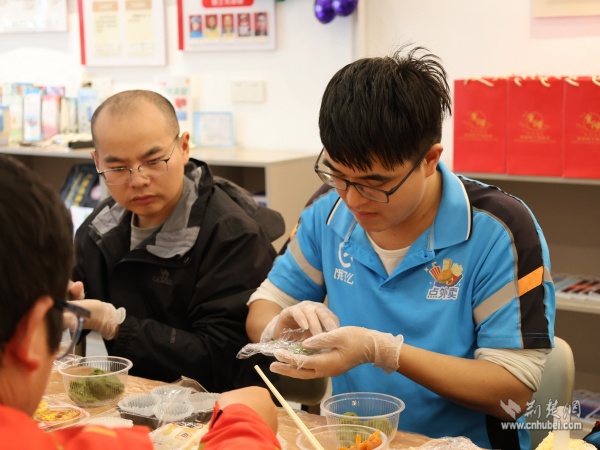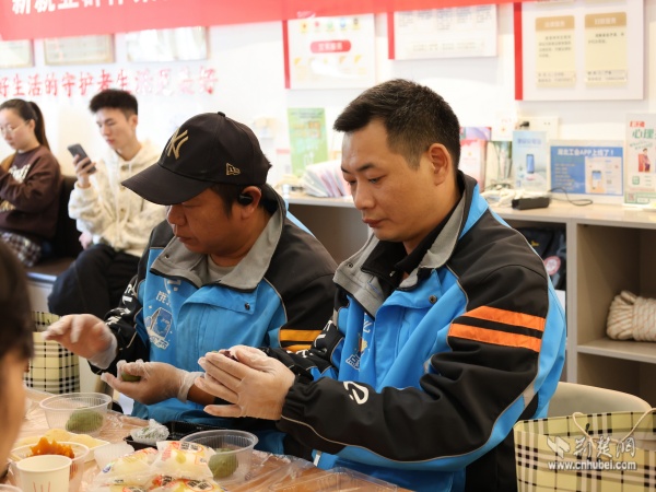 在制作青團(tuán)時(shí),現(xiàn)場同步開展“黃鶴家人茶話會”,搭建起代際對話的橋梁。花堤社區(qū)紫陽之星小區(qū)黨支部書記金文芳講述了小區(qū)變遷故事,傳遞長者對騎手們的關(guān)懷;新就業(yè)群體入黨積極分子樂倩倩則分享了送餐途中幫扶孤寡老人的暖心經(jīng)歷。兩代人的真誠交流深化了情感共鳴,現(xiàn)場洋溢著家人般的溫暖氛圍。