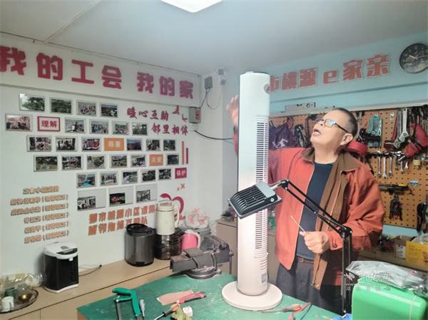這個(gè)充滿煙火氣的共享工具空間,位于社區(qū)17棟架空層。雖面積不大,卻五臟俱全,墻上整齊擺放著螺絲刀、萬(wàn)用表、扳手、電鉆等各類工具,操作臺(tái)上堆滿居民送來(lái)的待修物品。來(lái)自小區(qū)的退休工程師志愿者分工明確,有的排查小家電故障,有的調(diào)試自行車零件,耐心傾聽(tīng)需求、細(xì)致檢查物品,用專業(yè)素養(yǎng)贏得居民信賴。