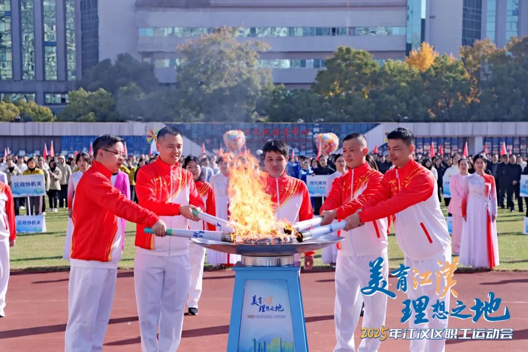 現(xiàn)場,“新興之火”“數(shù)智之火”“金融之火”“樞紐之火”“人文之火”五棒火炬依次點(diǎn)亮,張?jiān)?、付俊、邵青、張寶劍、孟廣松等15位勞模代表接力傳遞。燃燒的火焰,照耀著江漢區(qū)在科技創(chuàng)新、數(shù)字化轉(zhuǎn)型、金融強(qiáng)區(qū)、商貿(mào)物流、文商體旅融合等發(fā)展領(lǐng)域堅(jiān)定向前。當(dāng)所有火炬手共同點(diǎn)燃主圣火盆,彩球騰空,全場沸騰,運(yùn)動會正式開幕。