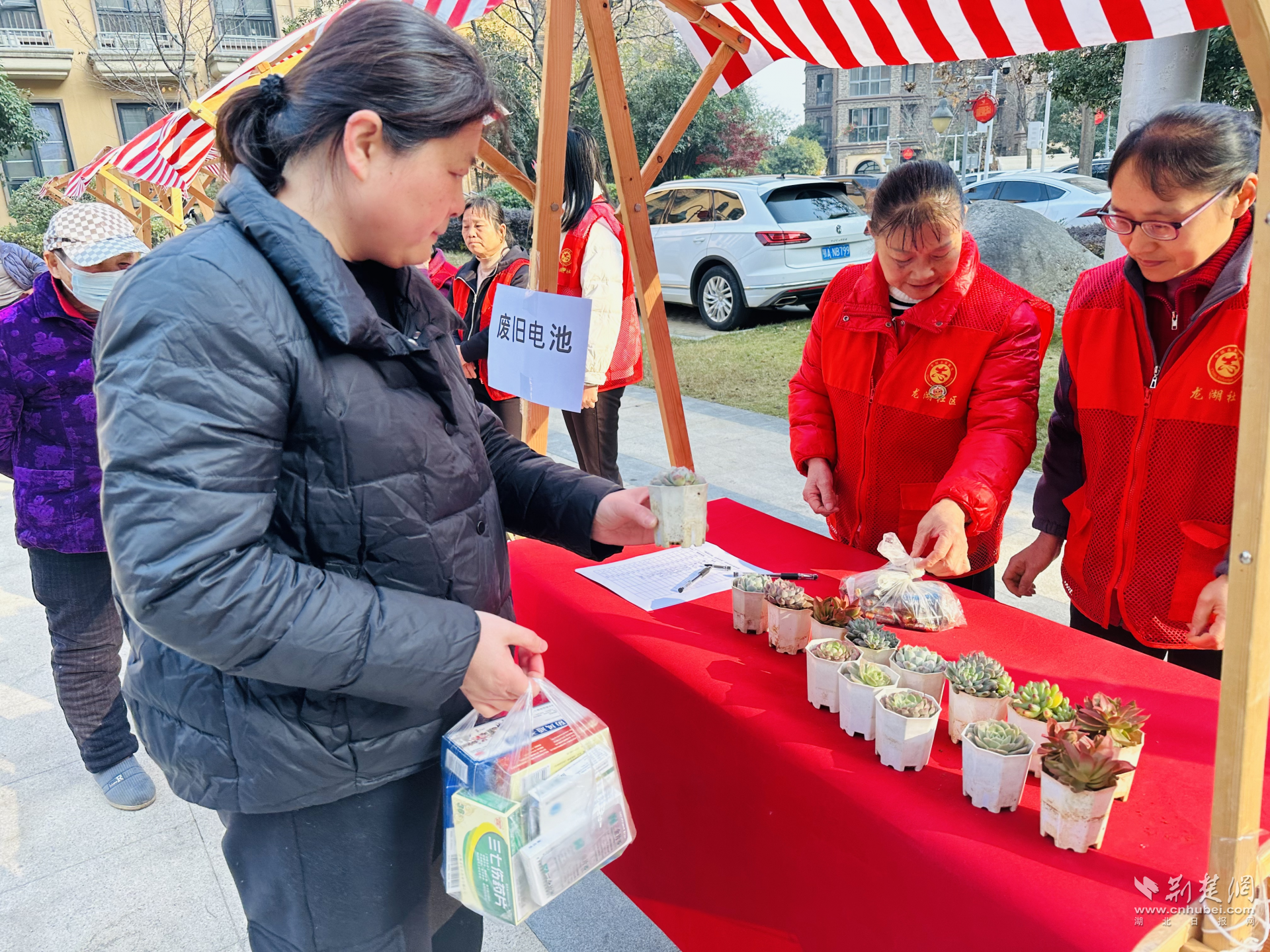 活動(dòng)現(xiàn)場(chǎng),社區(qū)工作人員與共建單位志愿者提前布置好兌換區(qū),多肉、綠蘿、長(zhǎng)壽花等綠植鮮嫩欲滴,垃圾袋、抹布等日用品擺放整齊,吸引了不少居民駐足咨詢。“家里攢了不少?gòu)U舊電池,一直不知道怎么處理,今天終于派上用場(chǎng)了!”居民張阿姨提著一袋子舊電池來到兌換點(diǎn),經(jīng)過志愿者清點(diǎn)登記后,順利換得一盆長(zhǎng)勢(shì)喜人的綠蘿。