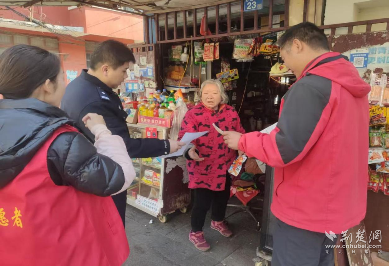 社區(qū)工作人員與民警向商戶(hù)宣傳禁放煙花爆竹政策。通訊員供圖