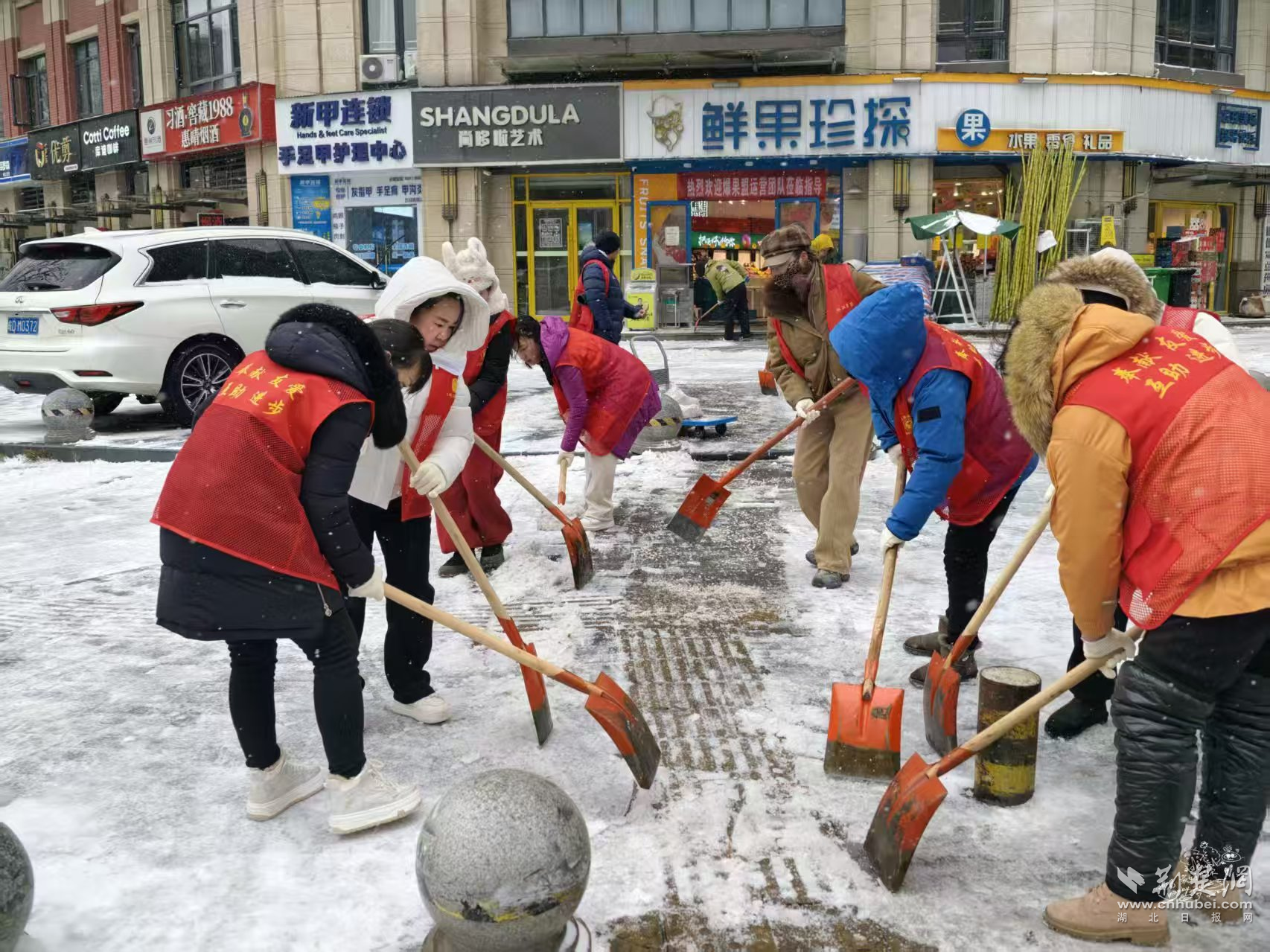 陳家墩社區(qū)則結(jié)合老舊小區(qū)多、坡道多的實際情況,提前明確分片包干責任,將單元門口、背街小巷和易結(jié)冰路段列為重點區(qū)域,組織街道工作人員與社區(qū)黨員志愿者、熱心居民并肩作戰(zhàn)。雪花落滿肩頭、化成水珠,大家卻顧不上拍一拍,鏟一鍬、掃一段、清一處,干勁十足?!翱吹铰访嫔戏e雪都清理干凈了,才放下心來。”