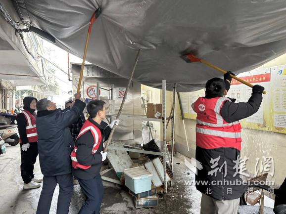 除雪過程中,工作人員發(fā)現(xiàn)一處老舊小區(qū)宿舍門前遮雨棚因積雪堆積嚴重變形,存在垮塌隱患。大家立即分工協(xié)作,有的手持長桿清理棚頂積雪,有的在下方拉起警戒線、疏導(dǎo)居民通行,及時消除了高空墜物風險,為居民撐起一把“安全傘”。