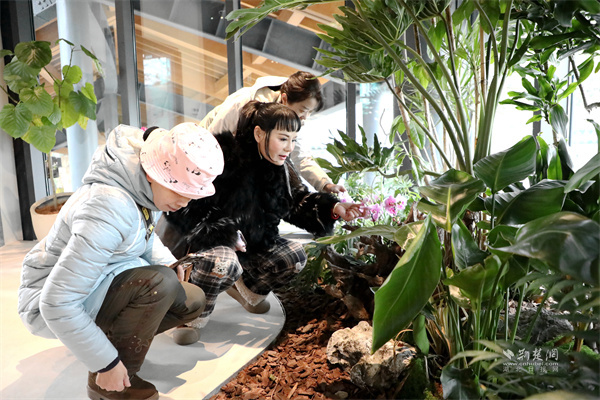 園藝師細致觀察“花嶼森活”綠色驛站植物搭配巧思。 通訊員供圖