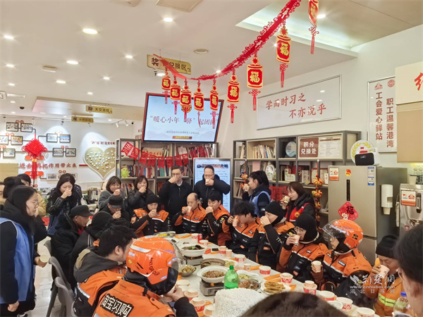 荊楚網(wǎng)(湖北日?qǐng)?bào)網(wǎng))訊(通訊員 趙坤 童霞)2月10日農(nóng)歷小年,武昌區(qū)南湖街道工會(huì)聯(lián)合中央花園社區(qū)、寶安社區(qū)在南湖街新就業(yè)群體服務(wù)工會(huì)驛站開展“暖心小年,‘驛’起團(tuán)圓”活動(dòng),邀請(qǐng)外賣小哥、快遞員、環(huán)衛(wèi)工人等20余名戶外勞動(dòng)者歡聚一堂,寫福字、玩游戲、吃團(tuán)圓宴,在歡聲笑語中,感受工會(huì)“娘家人”的溫暖。