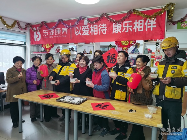 活動(dòng)當(dāng)天,讀書社區(qū)養(yǎng)老服務(wù)中心內(nèi)歡聲笑語(yǔ)、暖意融融。來(lái)自不同群體的志愿者們分工協(xié)作、配合默契,社區(qū)退役軍人服務(wù)隊(duì)的隊(duì)員揉面、拌餡有條不紊;武漢客運(yùn)段的志愿者們手法嫻熟,搓圓捏餡一氣呵成;居民志愿者們則在一旁燒水備碗、忙前忙后。大家圍坐在桌前,一邊包著湯圓,一邊拉著家常,在裊裊升起的熱氣中,心與心貼得更近了。