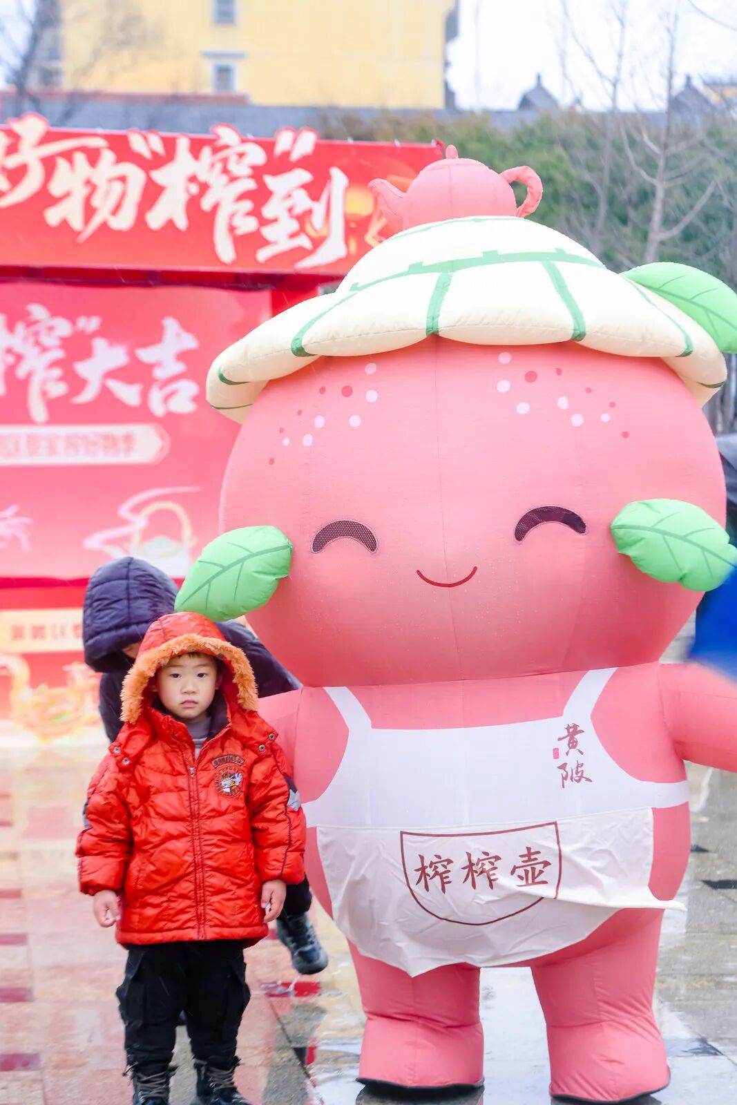 ? 小朋友在活動現(xiàn)場與榨榨壺合影。
