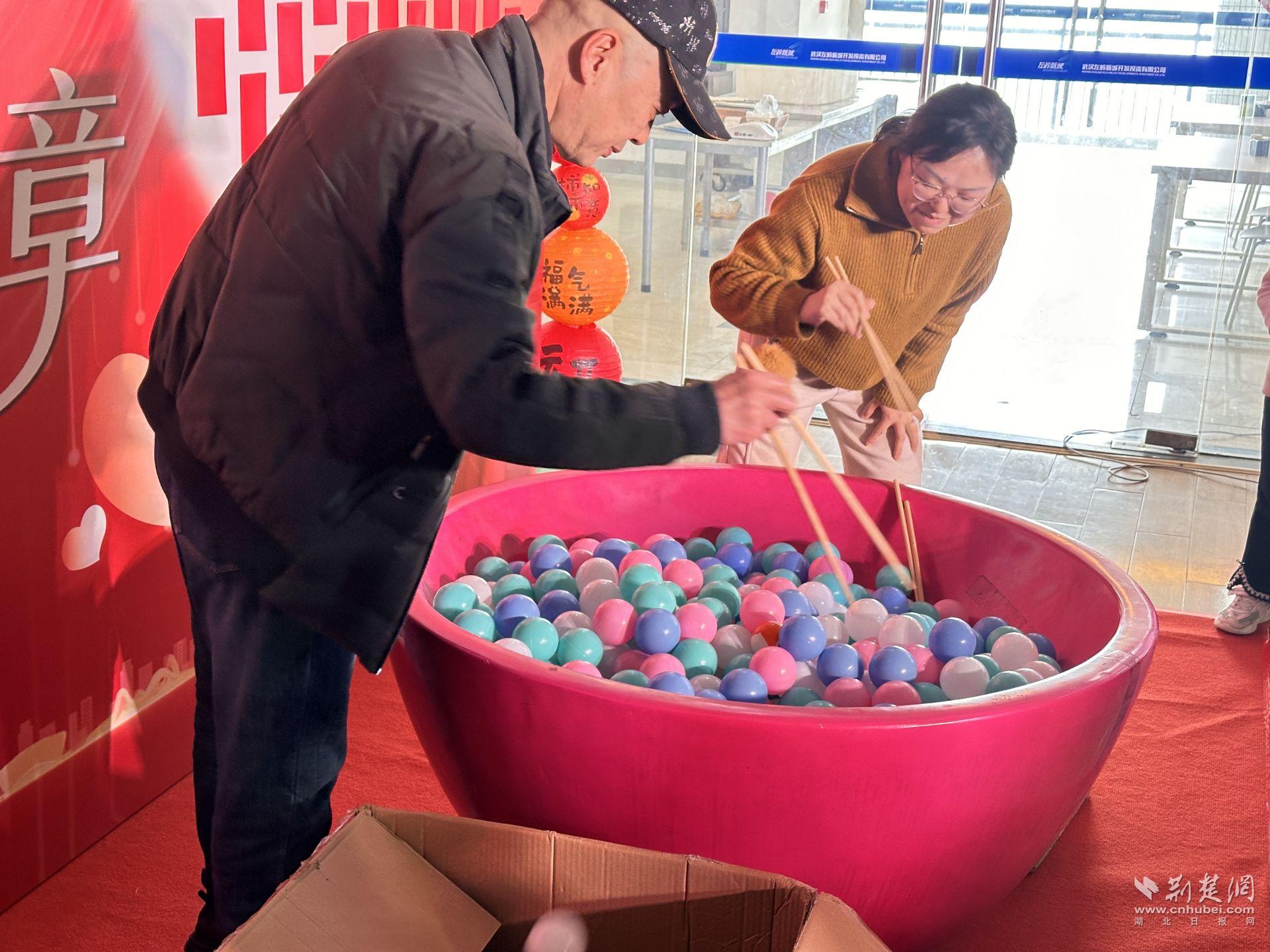 隨后,互動環(huán)節(jié)正式開啟。核心區(qū)域的巨型“團圓碗”成為焦點,碗中盛放象征團圓的“元宵球”,員工們依次上場,用長筷在30秒內(nèi)夾取“元宵”,現(xiàn)場計數(shù)、排名,氣氛迅速升溫。
