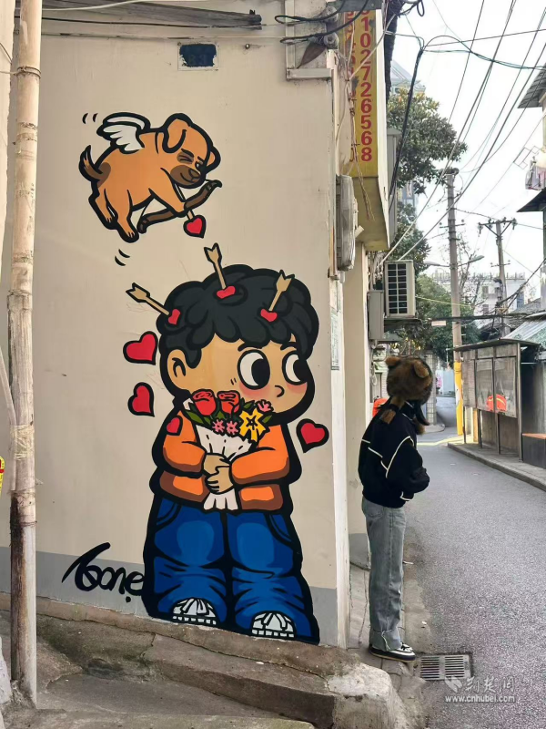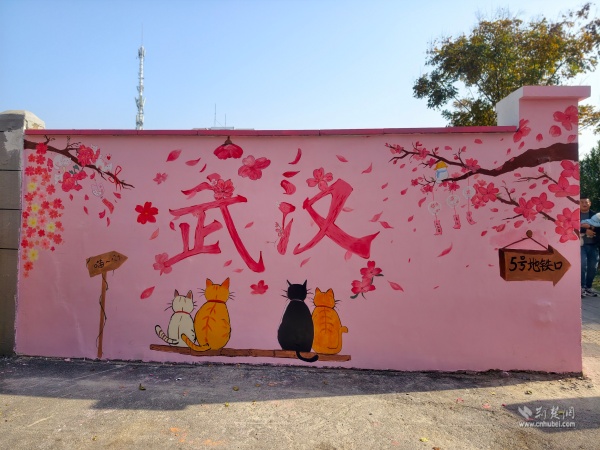 走出彭劉楊路地鐵B2口,來到社區(qū)八卦井旁,一面粉墻惹人注目,櫻花飛揚(yáng)、四只貓咪相依蹲坐。在社區(qū)攜手武漢學(xué)院藝術(shù)與傳媒學(xué)院青年志愿者開展的“墻上生花,美在西廠”主題活動(dòng)中,10余名青年志愿者用畫筆和創(chuàng)意,打造出這面繪有櫻花和貓咪的“武漢”主題墻。