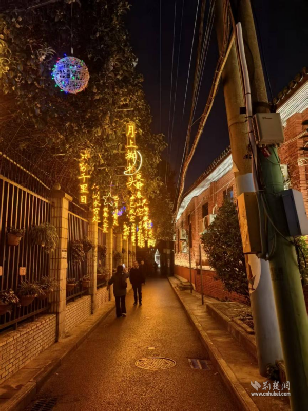 這個(gè)由社區(qū)與共建單位湖北省農(nóng)業(yè)事業(yè)發(fā)展中心共同策劃改造的“詩詞長(zhǎng)廊”,創(chuàng)新融合了詩詞文化與光影藝術(shù)。夜幕降臨,一盞盞詩詞燈帶悄然亮起。柔和光暈下,“晴川歷歷漢陽樹,芳草萋萋鸚鵡洲”的古韻與墻上“蒜鳥”“七飯”等俏皮的武漢方言點(diǎn)綴其間,歷史與當(dāng)下在光影交錯(cuò)間完成了隔空對(duì)話。